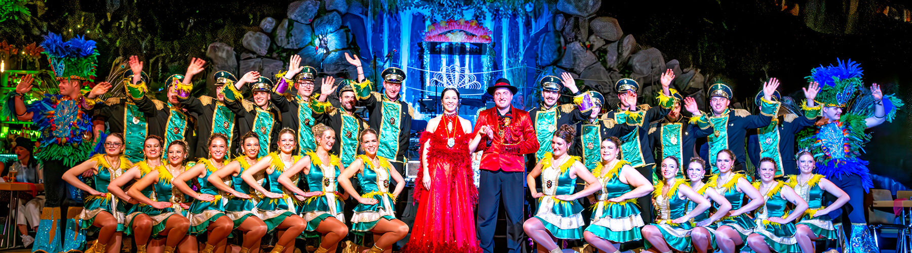 Schon beim Reinkommen ist klar: Das hier ist kein „Ball“ im braven Sinn. Die Halle ist verwandelt – üppiges Grün, Licht wie im Tropenhaus, und hinten über allem die weiß leuchtende Silhouette: eine Cristo-Redentor-Statue als Deko, passend zum brasilianischen Motto der Karnevalvereinigung. Es glitzert, es funkelt, es summt. Über den Tischen: Masken, Pailletten, Federboas. Über den Gesichtern: dieses spezielle Grinsen, das sagt: Heute darf alles ein bisschen mehr sein.