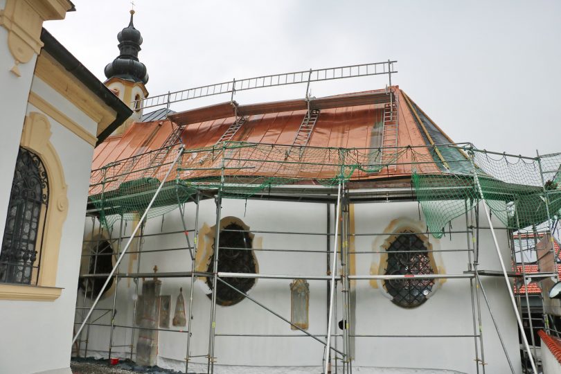 „Die Bauarbeiten an der Kreuzkapelle gehen ihrem Ende entgegen“, so Werner Weyerer, der Kirchenpfleger von Aschau. Mittlerweile wurde das Langhaus der Kapelle mit einem neuen Kupferdach eingedeckt und die Malerarbeiten im Außenbereich sind auf der Südseite voll im Gange. „Wir liegen trotz Corona gut im Zeitplan“ freut sich Werner Weyerer. „Die Arbeiten konnten alle planmäßig erledigt werden. Nach dem Abschluss aller Arbeiten und – wenn es die Corona-Bestimmungen zulassen – werden wir mit der ganzen Pfarrgemeinde das schmucke kleine Gotteshaus in seiner neuen Pracht gebührend feiern“. Schon in den letzten Jahren wurden Sanierungs- und Erhaltungsmaßnahmen durchgeführt, berichten Pfarrer Paul Janßen und Kirchenpfleger Werner Weyerer, um dieses Kleinod auch für die kommenden Generationen zu erhalten. In den vergangenen Jahren mussten umfangreiche Renovierungsarbeiten durchgeführt werden. Der Außenputz im Sockelbereich wurde abgeschlagen und nach der Neuanlage der Drainage durch die Firma Andreas Dörfl aus Aschau saniert. Die völlig marode Holzschindeldeckung wurde durch ein Kupferdach ersetzt und von der Spenglerei Wimmer aus Obing ausgeführt. Als Abschluss aller Außenarbeiten haben nun die Malerarbeiten begonnen, das ganze Haus wird in ein strahlendes Weiß getaucht und die Fenster werden, wie bei der daneben stehenden Pfarrkirche, ocker umrahmt.