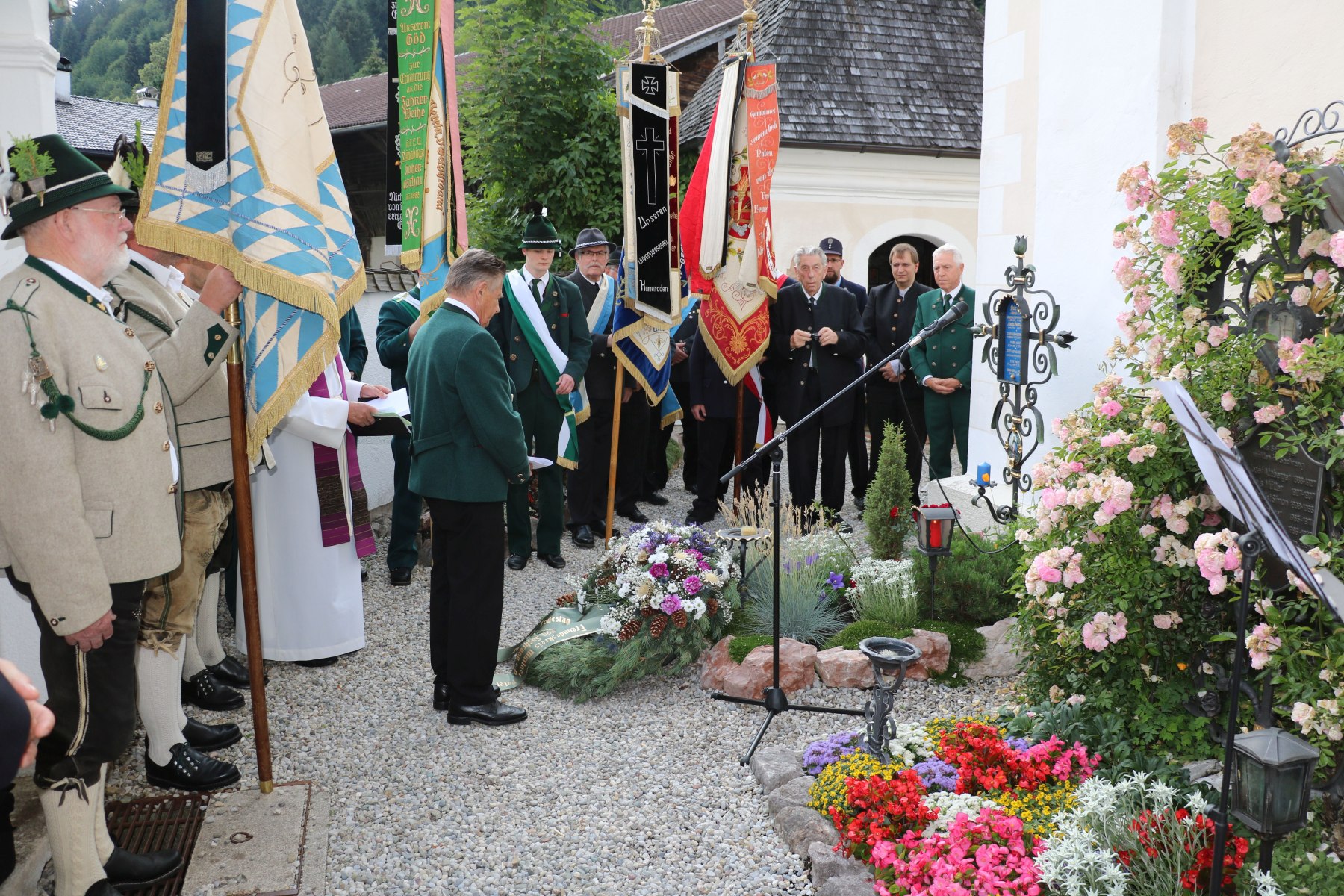 Dieter Höpfner, der kommissarische Vorsitzende des Freundeskreises Müllner Peter von Sachrang am liebevoll geschmückten Grab des dörflichen Universalgenies im Sachranger Friedhof