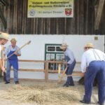 An diesem Sonntag hatten die Besucher die Möglichkeit, sich über Arbeitsgänge und Funktionsabläufe der Erntezeit von anno dazumal zu informieren oder Erinnerungen aus Großvaters Zeiten zu wecken. Hauptattraktion der mehrstündigen Veranstaltung war die Vorführung des Dreschens mit dem Dreschwagen und das Drischldreschen mit den Dreschflegeln. Die Organisatoren drehten dabei das Rad der Zeit zurück, um den Besuchern einen Einblick in die Landwirtschaft und altes Handwerk der sogenannten “guaden oiden Zeit” zu gewähren. Zwischendurch führte der Trachtlernachwuchs verschiedene eigens einstudierte Volkstänze auf, wozu sie viel Beifall und Applaus ernteten.