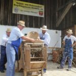 Zu sehen gab es hierbei eine ganze Menge: Das Drischldreschen, das nur noch wenigen bekannt ist, wurde von vier jungen Männern unter der Anleitung von Michael Brandlmeier vorgeführt. Obwohl das Drischldreschen leicht aussieht, ist es eine schweißtreibende Arbeit, bei der viel Konzentration und ein gutes Taktgefühl erforderlich ist. Die vorgestellte Putz- beziehungs-weise Windmühle diente zur Getreidereinigung nach dem Dreschen. Sehr gut kamen bei den Besuchern die alten Handwerksarbeiten an, die von den Vereinsmitgliedern vorgeführt wurden. Das Seil- und Strickmacherhandwerk führten die Kapfinger Paul Selmansberger und Kastulus Wimmer zusammen mit ihren Ehefrauen bereits seit Anfang vor, also seit 30 Jahren. Auch selbstgebrannte sowie Staatspreisprämierte Obstbrände sowie Liköre standen zur Probe bereit. Die Kunst des Balkenhauens aus einem Baumstamm führten die drei Zimmerer Michael Brandlmeier junior, Stephan Peißinger und Sebastian Spierer den interessierten Besuchern vor. Die Oldtimerfreunde aus dem benachbarten oberbayerischen Kirchberg/Schröding sowie die Standmotoren- und Bulldogfreunde aus Moosburg und die Bulldogfreunde “Ois oid” aus Langenvils kamen mit restaurierten alten Bulldogs, Zweikrafträdern, Standmotoren sowie mit Traktoren-Veteranen in das Vilstal.