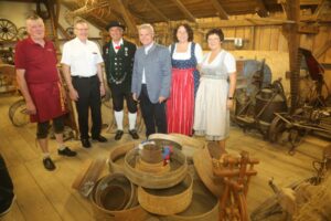 Im Trachtlervereinsstadl ist ganzjährig eine landwirtschaftliche Geräteschau und altes Handwerk ausgestellt, davon wollten sich die Ehrengäste überzeugen von links nach rechts: Trachtler-Vorsitzende Hans Voitenleitner, Bürgermeister Georg Spornraft-Penker, Museumsleiter Peter Seidel, Landrat Peter Dreier, Landteagsabgeordnete Ruth Müller zusammen mit Petra Dreier
