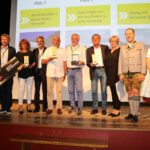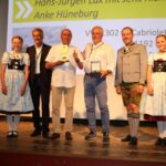 Hans Jürgen Lux und Jens Richter (Mitte) gewannen die ADAC Europa Classic 2023 und erhielten beim Galaabend in der Aschauer Festhalle aus der Hand von ADAC-Klassik-Referent Professor Dr. Mario Theissen (zweiter von links) und Aschaus Tourismuschef Herbert Reiter (zweiter von rechts) ihren Pokal, assistiert von Helena (links) und Aurelia (rechts) vom Aschauer Trachtenverein „Griabinga“.
