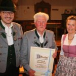 Seit 70 Jahren ist Leonhard Obermaier, der Westner-Hartl von Stetten, Mitglied bei den Wildenwarter Trachtlern. „Für dieses Ereignis haben wir gar kein Ehrenzeichen mehr vorgesehen, also haben wir für den Hartl extra eine Urkunde entworfen“ so Helmut Freund. „Viel Erfahrung sammelte sich in den letzten Jahrzehnten für die Trachtensache und den Wildenwarter Trachtenverein an“, so der Vorsitzende des Wildenwarter Trachtenvereins beim Vereinshoagascht im gut besuchten Saal der Schlosswirtschaft. „viele junge Buam und Dirndl traten damals mit 15, 16 Jahren in den Verein ein und heute darf ich 18 von ihnen das Ehrenzeichen für ihre langjährige Vereinstreue übergeben“. Marianne Kronast, Peter Möderl und Johann Steindlmüller erhielten das goldene Ehrenzeichen des Vereins für 60 Jahre aktive Mitarbeit im Wildenwarter Traditionsverein, Josef Riepertinger bekam das Ehrenzeichen 50 für ein halbes Jahrhundert.