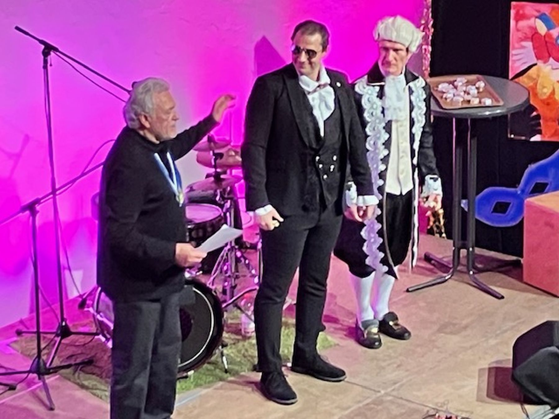 Organisator Peter Knoll (links) bedankt sich beim Technik-Team, Murat Deneri/Falco und Toni Neuer/Mozart.