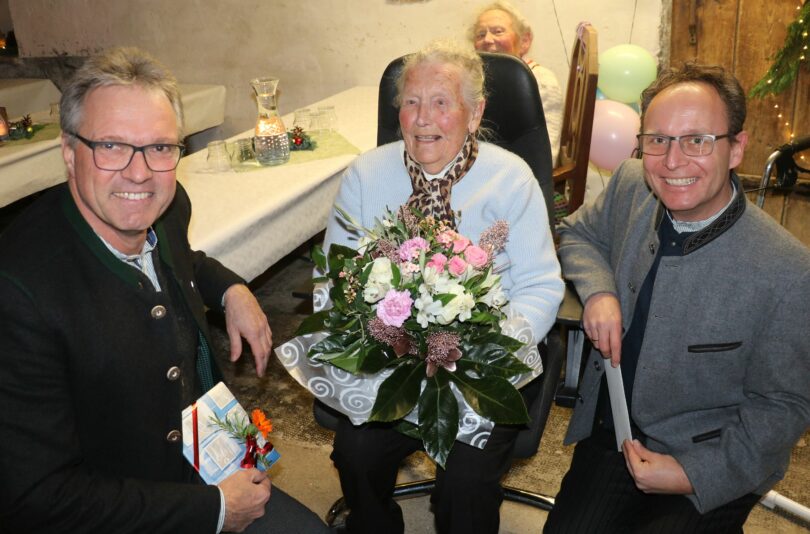 Bericht und Fotos: Heinrich Rehberg – Da gehen sogar Pfarrer und Bürgermeister in die Knie: Anna Hamberger, die Nanni vom Niggl in Pfannstiel feierte ihren 100. Geburtstag Für die Gemeinde Frasdorf gratulierte Bürgermeister Daniel Mair (rechts), zusammen mit Pfarrer Paul Janßen