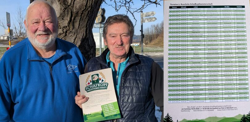 Foto: Die Spielleiter Anton Feistl (li.) und Hans Winkler mit dem Spielprogramm zu den Auerbräu-Schafkopfmeisterschaften 2026