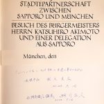Anlässlich des 50-jährigen Jubiläums der Städtepartnerschaft zwischen München und Sapporo ist derzeit der Bürgermeister der japanischen Stadt, Katsuhiro Akimoto, mit einer Stadtratsdelegation zu Besuch in München. Bei einem Empfang im Rathaus trugen Akimoto und die Mitglieder der Delegation sich heute in das Goldene Buch der Stadt München ein.