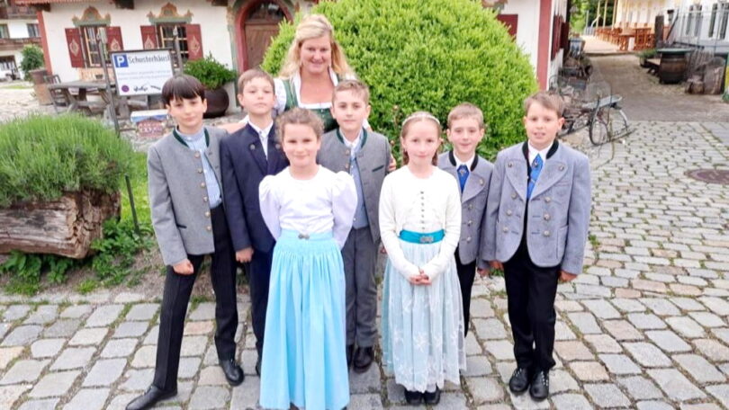 Irmi Fink (hinten im Bild) war dabei besonders stolz, denn sie begleitete die Kinder nicht nur zusammen mit Markus Schober als Gruppenleiter während der Vorbereitung auf die Erstkommunion, sondern gleichzeitig alle sieben „Baschtler“ Erstkommunionkinder auch als Jugendleiterin des GTEV Almenrausch Roßholzen.