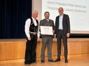 Für seine ehrenamtliche Arbeit und seine besonderen Verdienste wurde Obermeister Michael Andrä mit der Silbernen Ehrennadel des Bayerischen Zimmererhandwerks ausgezeichnet. V.l.n.r.: Präsident LIV Peter Aicher, Obermeister der Zimmerer-Innung Oberland Michael Andrä und Hauptgeschäftsführer LIV Kai Gajewski.