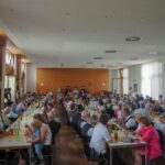 Die passende musikalische Umrahmung der festlichen Freiluft-Messe kam von Kirchenmusiker Andreas Penninger und der Wasner Musi unter der Leitung von Hans Rutz. Die Abschiedsfeier wurde aufgrund der Wetterbedingungen kurzfristig in den bereits dafür vorbereiteten und letztlich bis auf den letzten Platz gefüllten Pfarrsaal im ersten Obergeschoss verlegt. Dort folgte, moderiert von Domkapitular Dekan Monsignore Stadtpfarrer Thomas Schlichting, die Abschiedsfeier. Im Mittelpunkt stand dabei der Blick auf sieben gemeinsame Jahre und der Dank für eine gute Zusammenarbeit von Pfarrvikar und allen Mitarbeiterinnen und Mitarbeitern. Sogar eine „Delegation aus Rom“ (Reinhold Gietl, Veronika Wylezol, Elisabeth Schuch und Michaela Nagel) war hierfür angereist. Ebenso erwiesen ein Chor aus Haupt- und Ehrenamtlichen und die Vorsitzenden der Pfarrgemeinderäte dem Geistlichen die Ehre. Sie überreichten dem beliebten Priester zudem etliche Geschenke. Das fleißige Küchenteam der Stadtteilkirche samt Schankpersonal aus Heilig Blut servierte ein gemeinsames Mittagessen und sorgte für gekühlte Getränke, die angesichts der Hitze heiß begehrt waren.