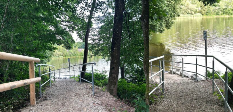 Um auch für Menschen mit Beeinträchtigungen einen einfacheren Zugang zum See am Freizeitgelände zu ermöglichen, hat der Landkreis Berchtesgadener Land in den vergangenen Wochen an der WC-Anlage der Liegewiese einen vorhandenen Seezugang ausgebaut. Durch den Bau einer Rampe ist es ab sofort deutlich einfacher, zum Wasser zu gelangen. Für zusätzliche Sicherheit für die Badegäste sorgen ein Metallgeländer direkt an der Rampe sowie ein Holzgeländer entlang des Kieswegs zum Ufer.