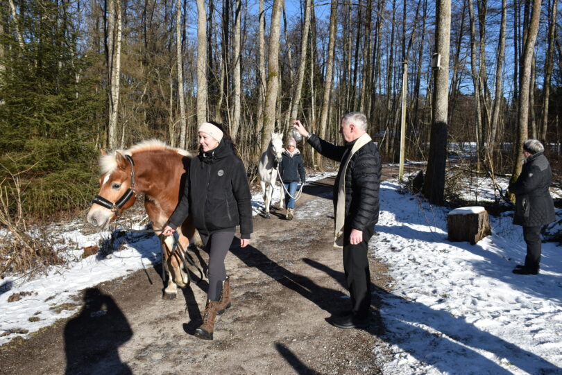 Pfarrer Martin Straßer kam mit der Ziach und Maria Blank mit der Flöte und beide begannen eine kleine Messe mit dem fast 400 Jahre alten Weihnachtslied „Zu Bethlehem geboren“. Diana, Seppi Susi, Lady und viele mehr – jedes Pferd wurde mit Namen vom Pfarrer aufgerufen, er wünschte sich, dass alle Tiere immer wohl behütet werden. Er sah die Pferde und alle Tiere als Mitgeschöpfe, die ein Menschenleben so sehr bereichern können. Die beiden Ponys Max und Lisa hatten es ihm besonders angetan, er ging zum Max und fand, der könnte doch ein guter Freund sein; denn Tiere führen Menschen zusammen. Martin Straßer sprach dann das Segensgebet, Vorstand Sigrid Pfeifer sprach die Lesung und zum Ende spielten der Pfarrer und Maria Blank noch ein Pferdelied.