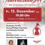 Wie jedes Jahr veranstaltet das Chiemgau-Orchester auch heuer wieder sein nun schon zur Tradition gewordenes festliches Adventskonzert. Es findet am Freitag, dem 12. Dezember um 19.00 Uhr im Chiemsee-Saal in Prien in kammermusikalischer Besetzung statt.