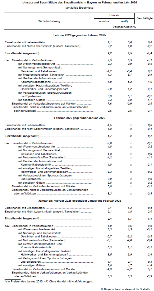 Wie das Bayerische Landesamt für Statistik nach den vorläufigen Ergebnissen der „Monatsstatistik im Einzelhandel“ berichtet, wächst der Umsatz im bayerischen Einzelhandel (ohne Kraftfahrzeughandel) im Februar 2026 im Vergleich zum Februar 2025 nominal (in aktuellen Preisen) um 2,2 Prozent und real (in bereinigten Preisen) um 1,5 Prozent. Die Zahl der Beschäftigten geht um 1,4 Prozent zurück.