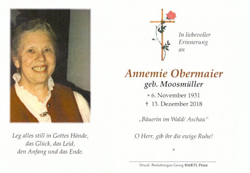Eine große Trauergemeinde fand sich in der Pfarrkirche „Darstellung des Herrn“ in Aschau i. Chiemgau ein, als für die im Alter von 87 Jahren verstorbene Annemie Obermaier aus dem Aschauer Ortsteil Wald das Requiem gefeiert wurde. Den Gottesdienst feierten Pfarrer in Ruhe Johannes Weindl und Diakon in Ruhe Hans Weber, für die musikalische Ausgestaltung sorgte der Aschauer Kirchenchor. Diakon Weber erinnerte bei seinem Rückblick auf das Leben von Annemie Obermaier daran, dass diese als älteste von fünf Geschwistern auf dem Schaffler-Hof der Familie Moosmüller in Göttersberg zur Welt kam und schon mit 15 Jahren viel Verantwortung übernehmen musste als ihre Mutter verstarb. Nach dem Besuch der Volksschule in Aschau und nach landwirtschaftlichen Arbeitsplätzen beim „Vogg“ in Gschwendt, auf der Steinling-Alm und bei der Familie Pfanzelt in Hohenaschau heiratete sie 1962 den Bauern Leonhard Obermaier in Wald. Leider blieb die Ehe kinderlos, mit ihrem Mann sorgte sie sich mit großer Hingabe um Feriengäste, um die Tiere sowie um den Garten. Annemie Obermaier war gerne Trachtlerin und weil sie bei den Trachtenvereinen Nieder- und Hohenaschau langjähriges Mitglied war, beteiligten sich die Fahnenabordnungen beider Vereine bei den Trauerfeierlichkeiten. Lange Zeit pflegte sie ihren im Jahr 2012 verstorbenen Ehemann, viele Jahre wurde sie hernach selbst zu Hause von den Pflegekräften des Ökumenischen Sozialdienstes Priental besucht, als ihre Kräfte immer mehr schwanden kam sie ins Altenheim St. Josef nach Prien, wo sie auch verstarb. Mit Bläserweisen auf dem Friedhof wurde der letzte irdische Weg von Annemie Obermaier musikalisch gestaltet.