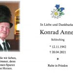 Im Alter von 78 Jahren verstarb nach schwerer Krankheit Konrad Anner aus Schleching. Mit ihm hat die Chiemgauer Trachtenbewegung einen besonders starken Kameraden verloren, dem Brauchtum, Heimat und Naturverbundenheit ein hohes Anliegen waren. Daran erinnerte in seiner Traueransprache in der Pfarrkirche St. Remigius Pfarrer Martin Strasser vom Pfarrverband Oberes Achental. Coronabedingt waren in der Kirche nur 41 Angehörige und Trauernde zugelassen, auf dem Friedhof fanden sich dann noch viele weitere Gläubige eingefunden, die sich vom Anner-Koni verabschieden wollten. Die Trauerfeierlichkeiten wurden volks- und blasmusikalisch von den Schlechinger Sängern, den Schlechinger Alphornbläsern und der Frasdorfer Tranzlmusi gestaltet, diesen Gruppen gehörte der Verstorbene selbst lange Zeit an.