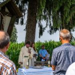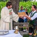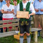 Fotos: Rainer Nitzsche – Eindrücke von der Andacht in Niedermoosen / Tobias Gaiser überreicht dem Riederinger Bürgermeister Christoph Vodermaier eine Tafel mit den Worten: “….und Beten hilft auch!“ / Segnung des Schildes durch Gemeindeassistentin Jacqueline Egold