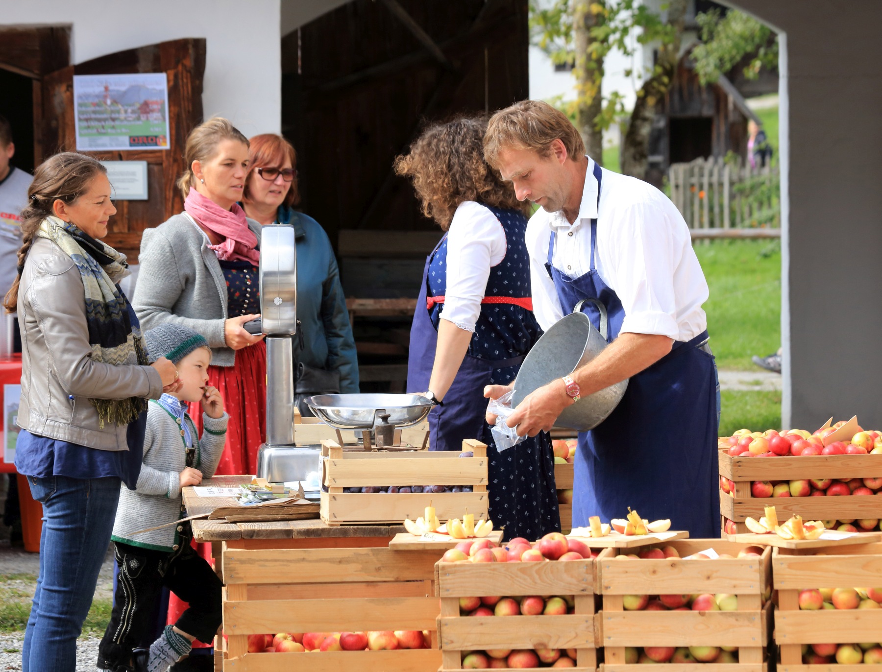 Auch für das leibliche Wohl ist bestens gesorgt: Bratäpfel und Apfel-Schmand-Flecken frisch aus dem Rohr, dazu eine Saftverkostung und der Apfelverkauf der Familie Blank aus Waging. © Bezirk Oberbayern, Archiv BHM, Fotografie Gerhard Nixdorf.