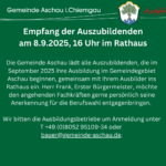 Die Gemeinde Aschau lädt alle Auszubildenden, die im September 2025 ihre Ausbildung im Gemeindegebiet Aschau beginnen, gemeinsam mit ihrem Ausbilder am 8. September um 16 Uhr herzlich zu einem Empfang ins Rathaus ein.