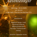 Das festliche Programm, das zur Einstimmung in die Adventszeit einladen soll, wurde von Sepp Schlemer und dem Pfarrgemeinderat Aschau zusammengestellt. Mitwirkende sind die Adlgasser Sänger aus Inzell, Holzklang Schlemer, Bläserquartett Kink und die Aschauer Trachtenkinder. Sebastian Aicher wird als Sprecher durch den Abend begleiten.