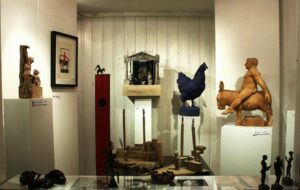 Ein Blick in das– Atelierfenster von Carsten Lewerentz in Staudach Egerndach mit Arbeiten des Bildhauers Norbert Däuber.