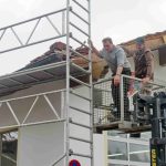 Fotos: Hötzelsperger – Atzinger Feuerwehrleute reparieren den Gebäudeschaden, der von einem bislang unbekannten LKW-Fahrer verursacht wurde.