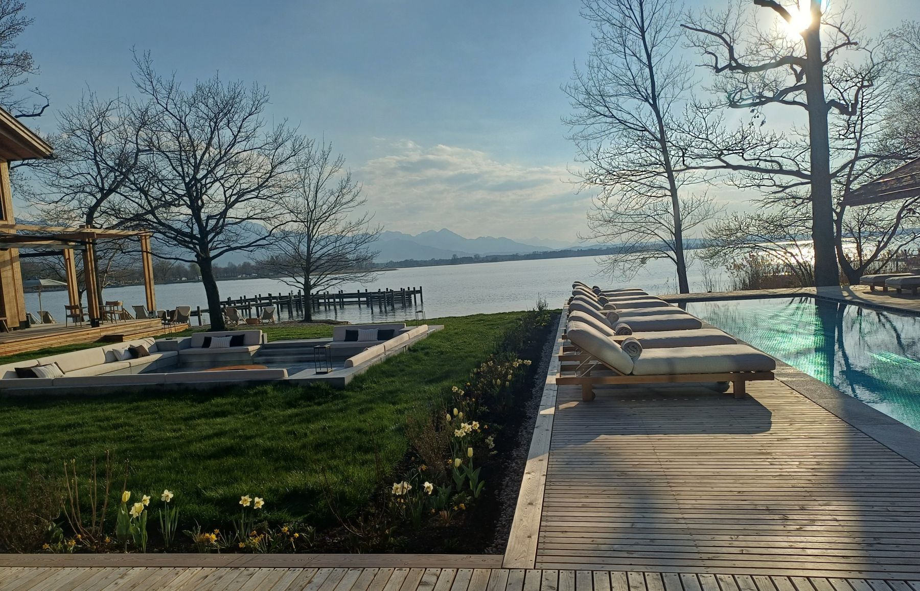 Blick auf die Freianlagen und den See am Tag der Vernissage bei strahlendem Sonnenschein.