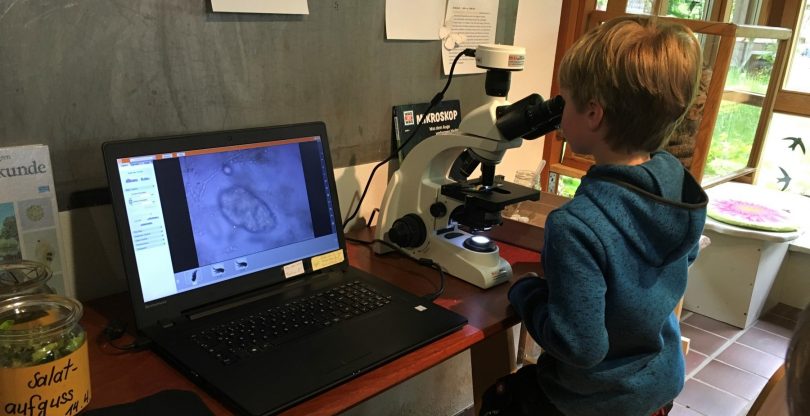 Kathi Stöckl vom LBV lud kleine und große Naturforscher ein zum Mikroskopieren mit dem neuen Mikroskop des Naturpavillons, das die betrachteten Objekte gut sichtbar auf den Laptop projizierte. An den Kosten für die Anschaffung dieses hochwertigen Mikroskops beteiligte sich maßgeblich der Abwasser- und Umweltverband Chiemsee (AUV), der damit die Umweltbildungsarbeit am Naturpavillon unterstützt. Zu beobachten waren sowohl Zooplankton wie Hüpferlinge, Wasserflöhe, Rädertierchen, Pantoffeltierchen und Glockentierchen als auch Phytoplankton wie verschiedene Algenarten, zum Beispiel Schmuckalgen und fädige Grünalgen. Als Besonderheit unter Einzellern gab es Volvox zu entdecken; dabei handelt es sich um eine Grünalgenkolonie, die in einer Gallerthülle sitzt und bereits Arbeitsteilung betreibt.