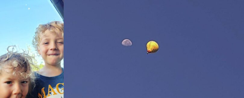 Begegnung auf hoher Höhe oder der Ballonflug zum Mond – Zu einer seltenen Begegnung kam es an diesem Donnerstagmorgen hoch über der Marktgemeinde Prien a. Chiemee. Ein in der Früh gestarteter Heißluftballon machte sich auf in Richtung Mond, der sich noch nicht ganz von seiner nächtlichen Tour verabschiedet hatte.