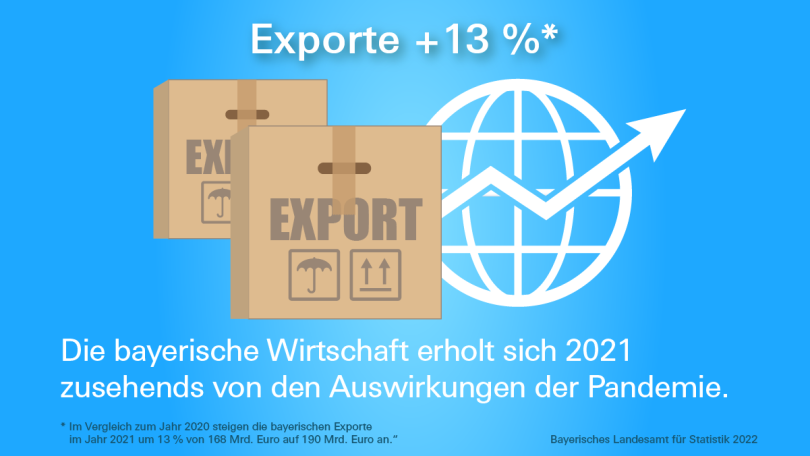 Trotz einer Abnahme von gut sechs Prozent auf 19,9 Milliarden Euro gegenüber 2019 sind die Vereinigten Staaten von Amerika 2021 weiterhin das wichtigste Exportland für bayerische Waren. „Maschinen“, „Personenkraftwagen und Wohnmobile“ sowie „medizinische Geräte und orthopädische Vorrichtungen“ sind mit einem Anteil von zusammen gut 47 Prozent die wichtigsten Exportgüter.