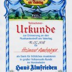 Selbstverständlich gab es auch bayerisches Bier, sowie bayerische Schmankerln wie Bratwurst, Leberkäs, Weißwurst und Brezn  aus der Almküche. Dazu eine leckere Erbsensuppe aus der Gulaschkanone von den  befreundeten Feuerwehrleuten aus Braubach am Rhein. Zum Abschluss des 8-stündigen Musik-Marathons gab es dann noch vom Vorsitzenden Jürgen Wörl für jeden Teilnehmer eine Urkunde, zusammen mit einer Einladung für den 20. Musiker-Treff, einem runden Jubiläum, im nächsten Jahr.