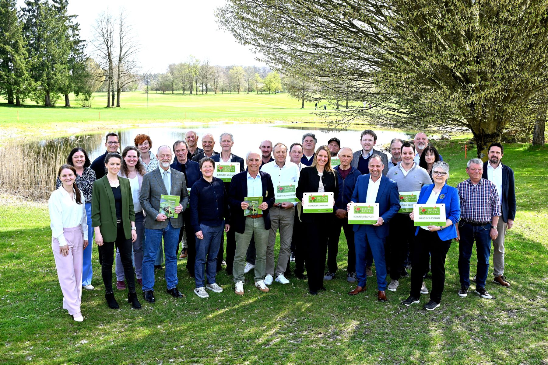 Gruppenfoto zeigt Bayerns Umweltminister Thorsten Glauber zusammen mit den Vertreterinnen und Vertretern der ausgezeichneten Golfclubs, sie halten in den Händen das Auszeichnungsschild “Blühender Golfplatz”.