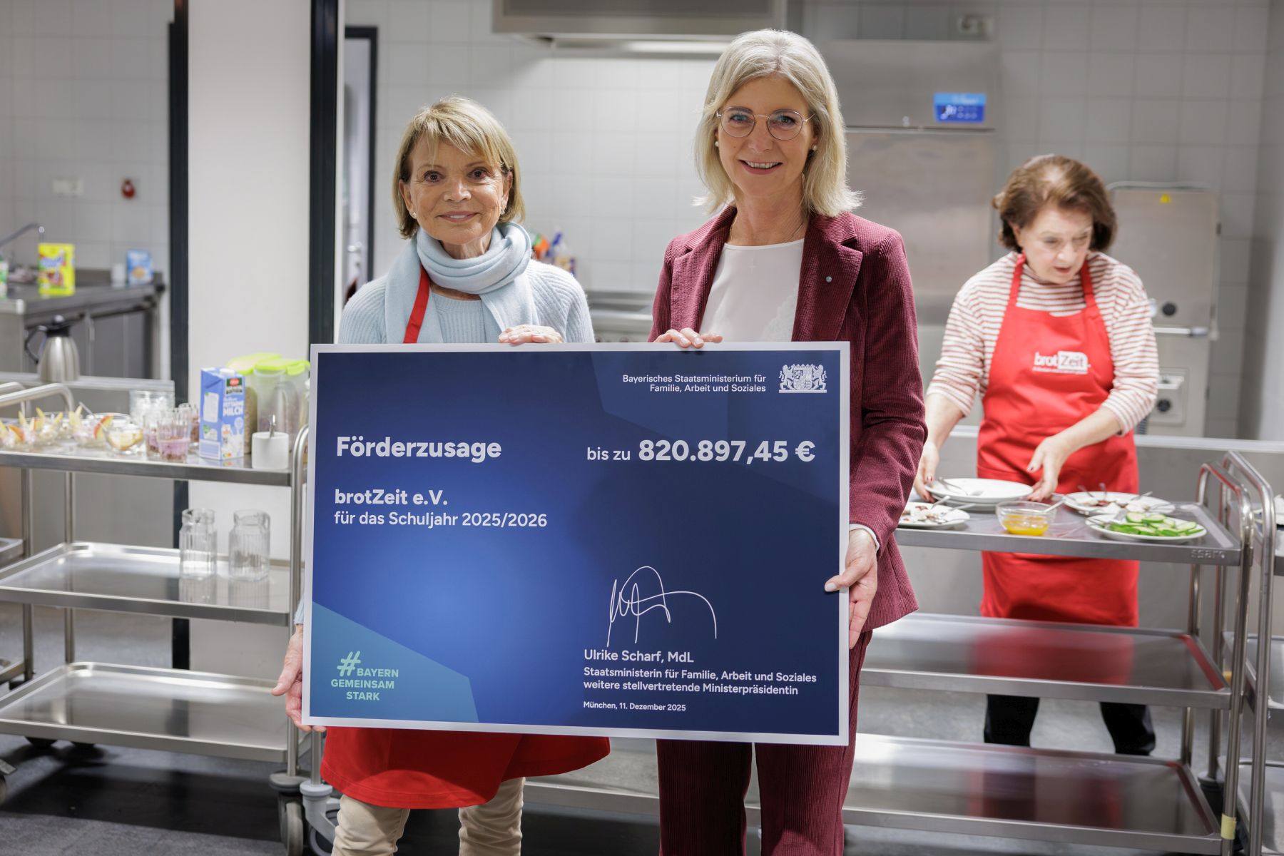 Die Bayerische Sozialministerin Ulrike Scharf und Vereinsgründerin und Aufsichtsratsvorsitzende Uschi Glas bei der Scheckübergabe im Anschluss an den gemeinsamen Besuch des Frühstücksprojekts an der Grundschule Weißenseestraße.