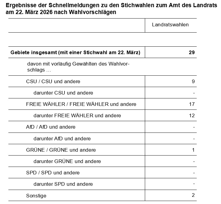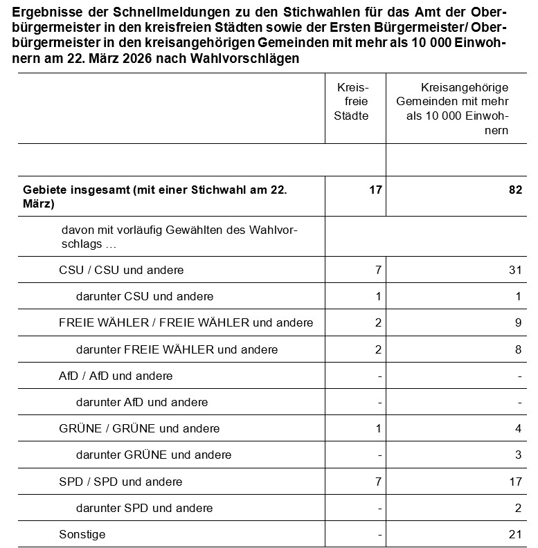 Am 22. März 2026 wurden in 17 kreisfreien Städten, 29 Landkreisen und 243 kreisangehörigen Gemeinden Stichwahlen zur Wahl der Oberbürgermeister, der Landräte und der ersten Bürgermeister durchgeführt. Vorangegangen war die Wahl am 8. März 2026, bei der in diesen Kommunen jeweils keiner der Bewerberinnen und Bewerber die absolute Mehrheit der gültigen Stimmen erringen konnte. Wie das Bayerische Landesamt für Statistik auf Basis der Schnellmeldungen mitteilt, konnte in den kreisfreien Städten und Landkreisen die CSU 16, die Partei FREIE WÄHLER 19, die SPD sieben, die GRÜNEN zwei sowie zwei Wählergruppen die Stichwahlen gewinnen (jeweils einschließlich gemeinsamer Wahlvorschläge). Diese und weitere Ergebnisse zu den Oberbürgermeister- bzw. Bürgermeisterwahlen in den kreisangehörigen Gemeinden mit mehr als 10 000 Einwohnern sind unter www.kommunalwahl2026.bayern.de sowie in einem Statistischen Bericht veröffentlicht.