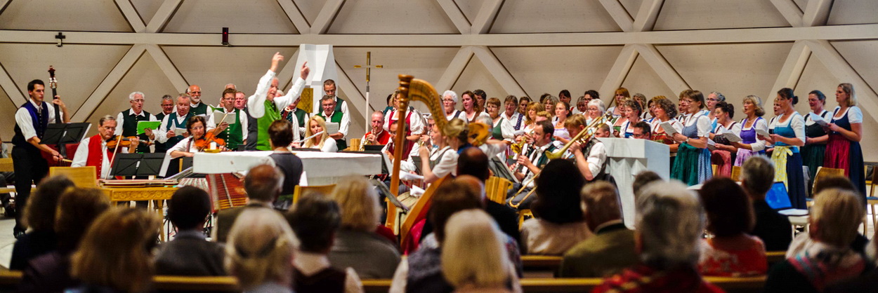 Außerdem traten die Audorfer Sängerinnen, der Solist Andreas Smettan sowie das Große Ensemble Hans Berger auf. Insgesamt waren es ca. 60 SängerInnen und 20 Instrumentalisten, die das Konzert unter dem Motto „Bayrisch durchs Kirchenjahr“ im neu erbauten Gotteshaus zum Klingen brachten.