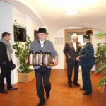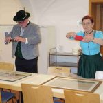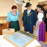 Fotos: Hötzelsperger – 1. Von links Ehrenvorsitzender Max Bertl, Landesschriftführerin Hildegard Hoffmann, William Hetzler und Landesvorsitzender Günter Frey mit Werken von Nikolaus Hipp und Rudolf L. Reiter. 2. Betrachtungen der Kunstwerke im Trachtenkulturzentrum Holzhausen. 3. Ehrenvorsitzender Max Bertl und William Hetzler. 4. Landesvorsitzender Günter Frey bedankt sich mit dem Buch „Trachtenlandschaft Bayern“ bei William Hetzler.
