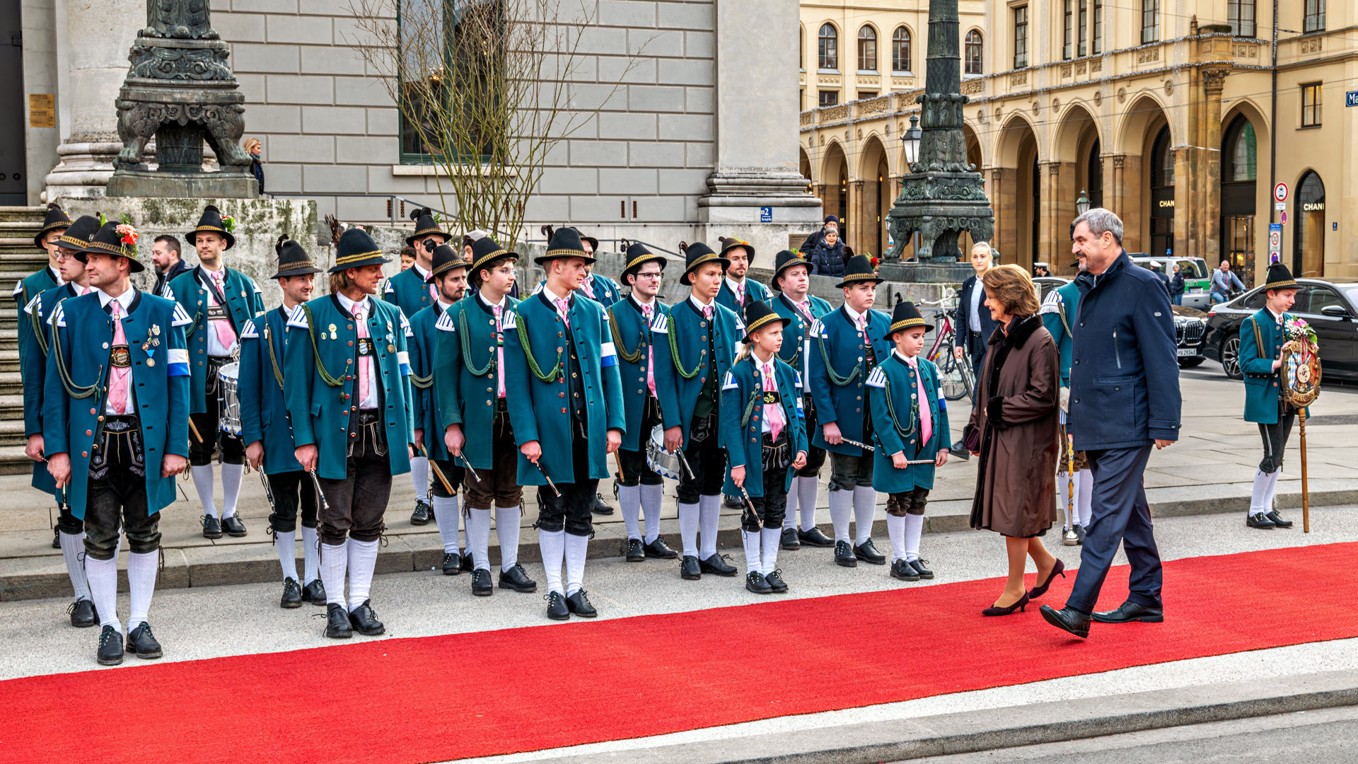 Roter Teppich für Schwedens Königin Silvia: Empfang mit Gebirgsschützen und bayerischer Tracht in München