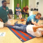 Michael Stodola von den Maltesern führte in Zusammenarbeit mit der Lebenshilfe in der Werkstatt der Lebenshilfe in Anger eine Erste-Hilfe-Ausbildung für Bewohner verschiedener Einrichtungen durch, die dabei von Auszubildenden zum Heilerziehungspfleger unterstützt wurden.  Die Azubis Mona, Abdullah, Hamdi, Paul und Regina befinden sich im zweiten und damit vorletzten Jahrgang an der Fachschule für Heilerziehungspflege an der Staatlichen Berufsschule 3 in Traunstein. Für sie war dies eine Prüfungssituation im Zusammenhang mit dem Projekt: „Erste Hilfe-Ausbildung für Menschen mit Beeinträchtigung und Hilfestellung durch ihre Pfleger“.