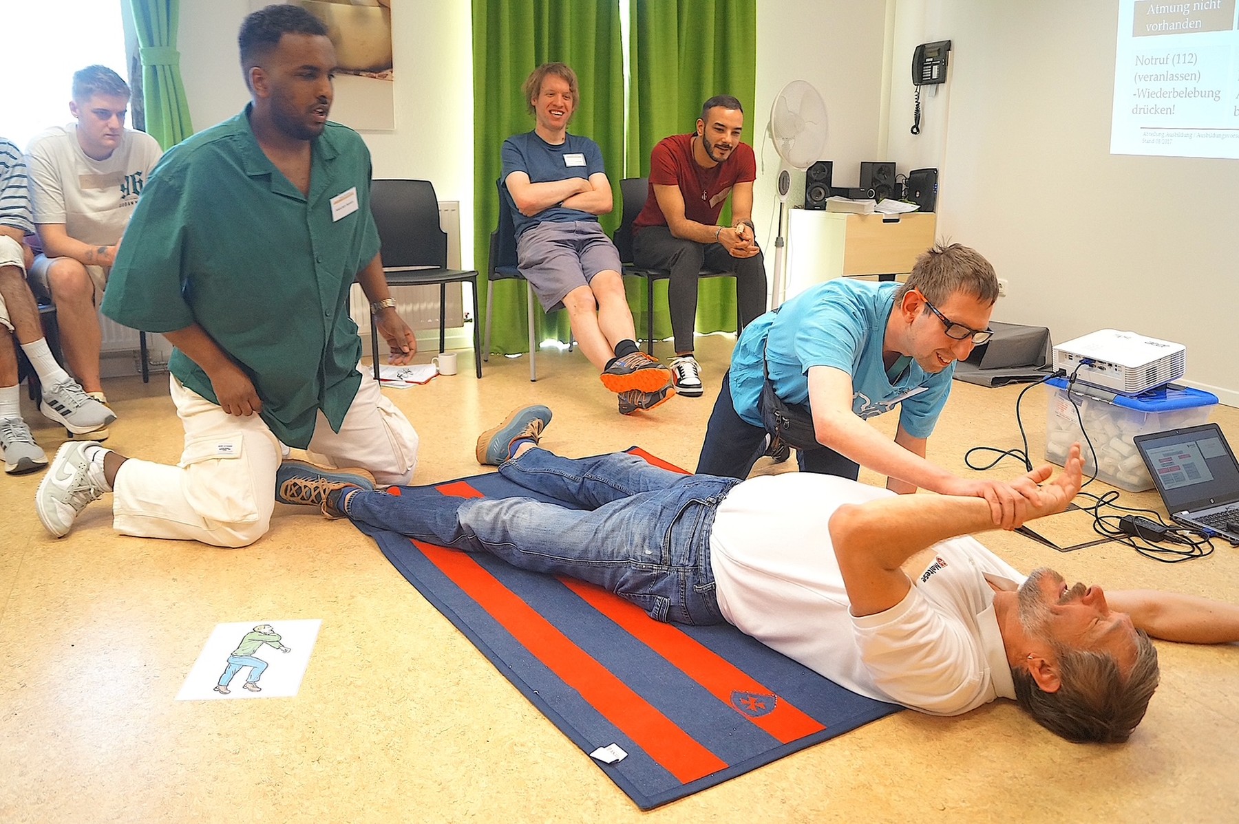 Andreas bringt den Kursleiter in die stabile Seitenlage, Azubi Abdullah ist bereit zu helfen.