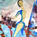 Die Künstlerin fasst ihre Wahrnehmungen und Eindrücke der Menschen und ihrer Umgebung oft in annähernd gegenständlichen, aber farblich verfremdeten Bildern, aber auch abstrakten Kompositionen, bei denen die aussagekräftigen Titel wie „Feuersturm“, „Maske“ oder „Fächer“ Ansätze zur Interpretation geben mögen. Gleich am Eingang fällt das großformatige Bild „Durchbruch“ in Acryl-Mischtechnik ins Auge – eine anscheinend tanzende Frau, die sich, halb dem Betrachter zugewandt, offensichtlich glücklich von einer Sphäre in eine neue bewegt. Die erhobene Hand mit gespreizten Fingern scheint zu sagen „aufhalten könnt ihr mich nicht“. Ein ähnliches Lieblingsmotiv der Künstlerin ist das Bild „Wohin“ in mehreren Versionen. Eine aufrechte Frauengestalt von hinten mit großer Umhängetasche, jeweils in anderen Farben gehalten, bewegt sich selbstbewusst durch eine Art Türe, anscheinend in ein neues Leben.
