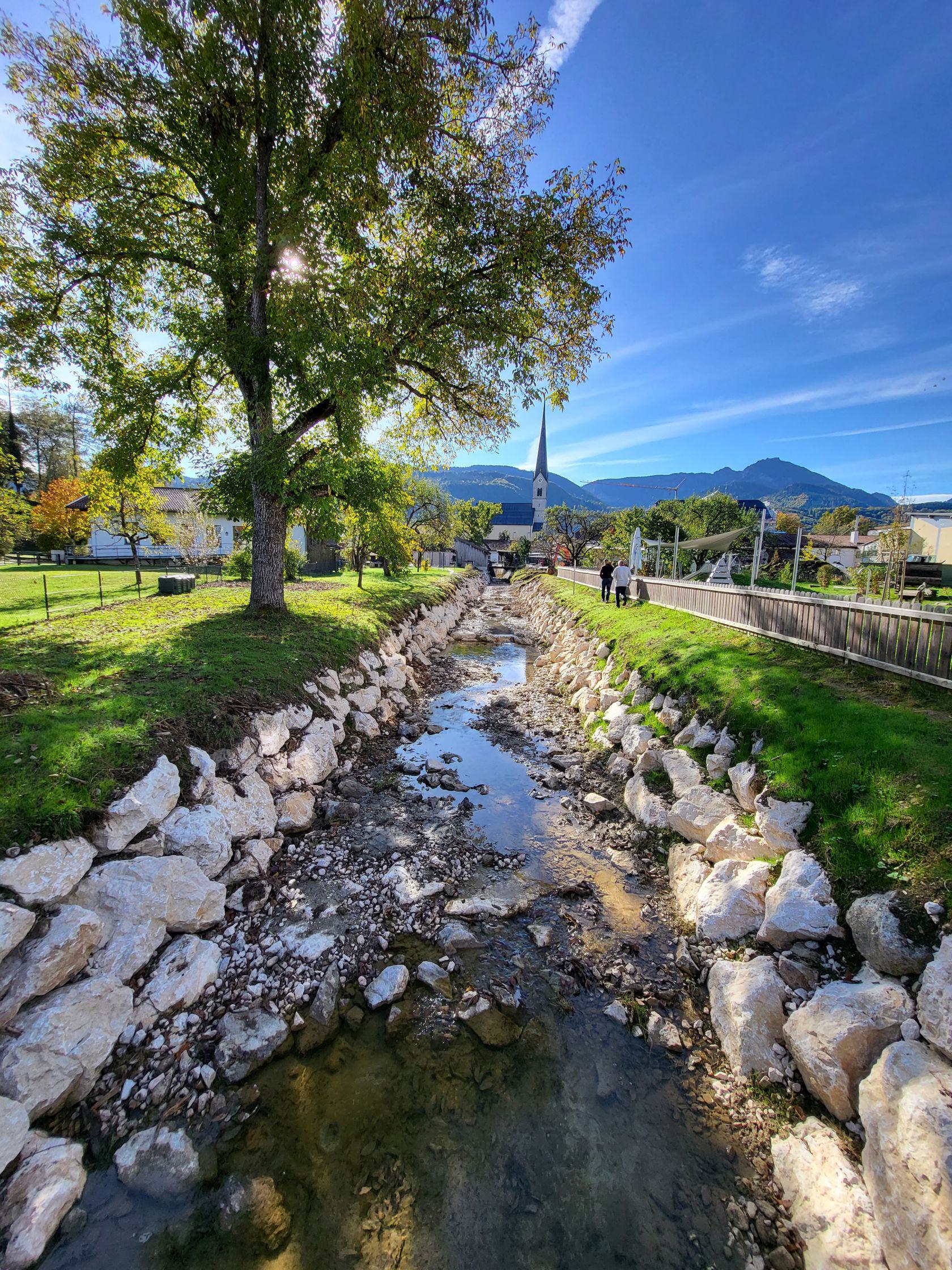 Nahe der Kirche in Bergen läuft derzeit der erste, etwa 100 Meter lange Bauabschnitt zur Sanierung des Bergener Bachs. Für seinen Unterhalt ist das Wasserwirtschaftsamt Traunstein mit seiner Flussmeisterstelle Traunstein zuständig. Foto: Wasserwirtschaftsamt Traunstein