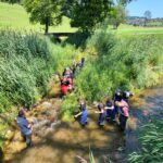 Jugendgruppe im Bach unterwegs: In Gummistiefeln waten die Jugendlichen der Jugendfeuerwehr Surberg durch den einmündenden Schlagbach. Sie sollen nicht nur Theorie hören, sondern das Ökosystem „Bach“ direkt erleben. Andreas Philipp vom Wasserwirtschaftsamt Traunstein begleitet sie und erklärt unter anderem, warum Fische unterschiedliche Strömungsverhältnisse in einem Gewässer brauchen.