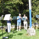 Ein gemeinsamer evangelischer Gottesdienst der Gemeinden Marquartstein und Übersee mit den Pfarrern Rudolf Scheller und Rainer Maier auf dem Platz vor der Streichenkirche St. Servatius ist etwas Besonderes. Unter freiem Himmel und bei schönstem Wetter wurde die Messe vom Posaunenchor aus Röckingen ganz wunderbar begleitet. Neun Posaunenchormitglieder schickten ihre kraftvollen Töne in die Bergwelt der Chiemgauer und Tiroler Alpen. Das schallte sogar bis hinüber zum Almkirta auf der Petereralm um die Ecke. Den Posaunenchor gibt es seit 1951, meist begleiten sie musikalisch kirchliche Veranstaltungen. Die zahlreichen Besucher auf dem Streichen begrüßten sie mit einem Stück von Reinhold Schelter „Welcome“.