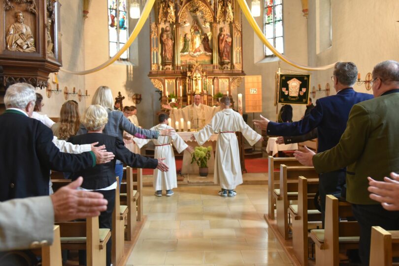 Das Foto zeigt den Moment, in dem Trachtenpfarrer Josef Tiefenhäuserböck die Besucher der Bergmesse beim Vaterunser dazu aufforderte, die Hände auszubreiten und so selbst zum Kreuz zu werden.