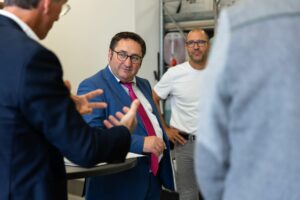 Staatssekretär Tobias Gotthardt im Gespräch mit Helmut Lampersberger und Jörg Maier, Technischer Leiter bei TBT