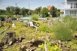 Auch wenn es auf den ersten Blick nicht so aussieht, extensive Dachbegrünung mit dickem, besonntem Totholz ist ein wichtiges Element für die Artenvielfalt: Magere, trockene Standortbedingungen sind in unserer Kulturlandschaft extrem selten, viele Insekten brauchen aber gerade das. Ein Großteil der ca. 500 heimischen Wildbienen braucht offene, warme Böden zum Brüten.