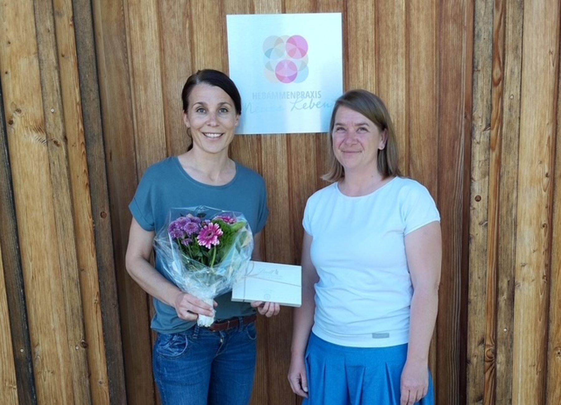 Als Zeichen der Anerkennung und Wertschätzung der Hebammen-Arbeit dankt Sandra Kunz von der Staatlich anerkannten Beratungsstelle für Schwangerschaftsfragen am Landratsamt BGL (rechts) Marie-Theresa Sprinzing von der Hebammenpraxis „Neues Leben“ stellvertretend für alle Geburtshelferinnen im Berchtesgadener Land. In der Praxis findet auch die Wochenbettambulanz statt.