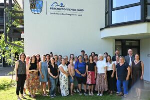 Die Vertreterinnen aus Kindertageseinrichtungen, die an der Kampagne „Startchance kita.digital“ im Berchtesgadener Land teilnahmen, und Mitarbeiterinnen des Amtes für Kinder, Jugend und Familien stellten sich im Rahmen der Abschlussveranstaltung der Kampagne mit Landrat Bernhard Kern (hintere Reihe, rechts) und stellvertretendem Landrat Michael Koller (hintere Reihe, 2. von rechts) zum Gruppenfoto auf.