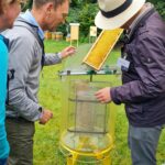 - jpg: Der Leiter der Fachberatung für Imkerei des Bezirks Oberbayern, Dr. Hannes Beims, erläutert Besuchenden das Honigschleudern © Rosi Raab